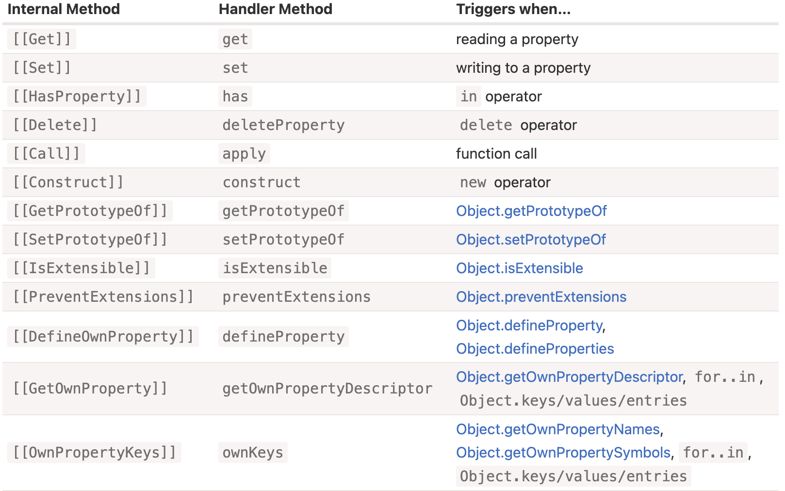 这里面可以通过改原型去hook所有子类,不多说。这里主要提下proxy,它能代理函数和对象,能拦截13种操作,详见Proxy and Reflect: