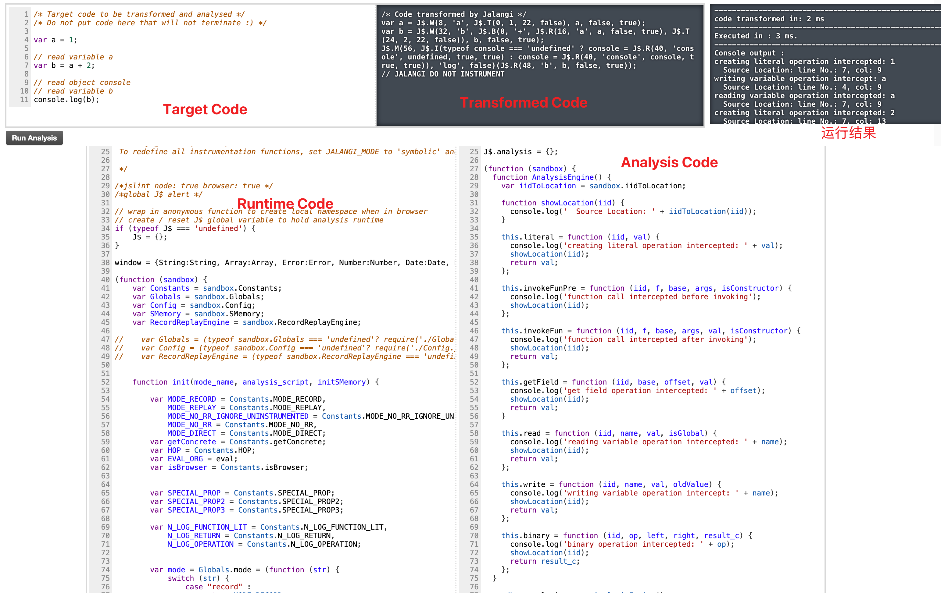 我们通常分析的是浏览器里的js,所以不能直接使用jalangi.js,而应该使用instrument.js对整个目录做插桩,它会对js插桩,对html插运行时,如果只想对js做处理,则需要修改代码,把运行时(包括headers和analysis等)全部插入被插桩的文件,否则会报错。